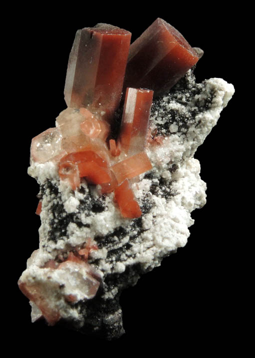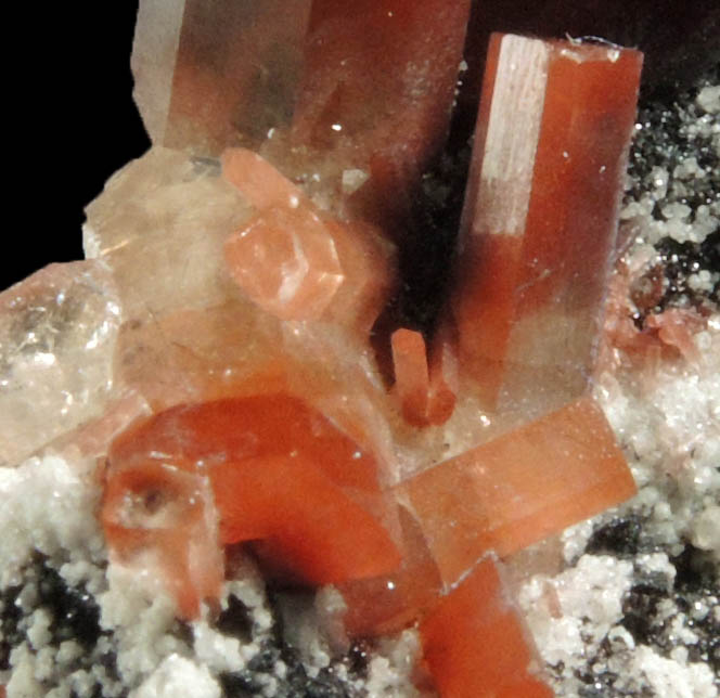 | Description: | Lustrous transparent topaz crystals to 8 mm with red-brown color caused by hair-like rutile crystal inclusions that are visible under magnification. The topaz crystals are prismatic form with flat basal pinacoid terminations. |