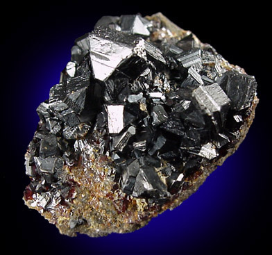 | Description: | Sharp, well crystallized sphalerite crystals on plate of matrix. The sphalerite crystals are dark red (almost black), and many show Spinel-law twinning. Ex. R. Bates Collection #941 |
