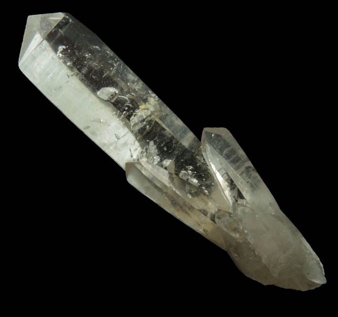 | Description: | Several lustrous transparent colorless quartz crystals with many negative crystal cavities (crystal-shaped hollow voids) and white inclusions. The quartz crystals have three dominant prism faces and three-faced pyramidal termination faces. Collected ca. 1975. This quartz outcrop was completely excavated by open pit mining ca. 1983. |