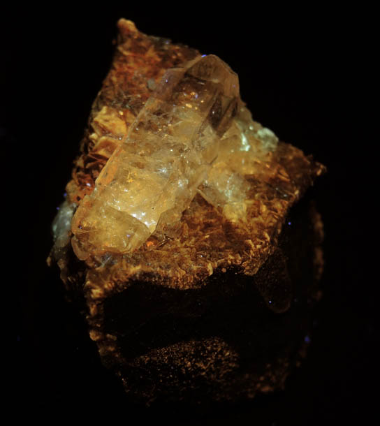 | Description: | Lustrous transparent colorless barite crystal on brown matrix coated with limonite-encrusted rhombic dolomite crystals to 1 mm. Originally acquired in August 1994 |