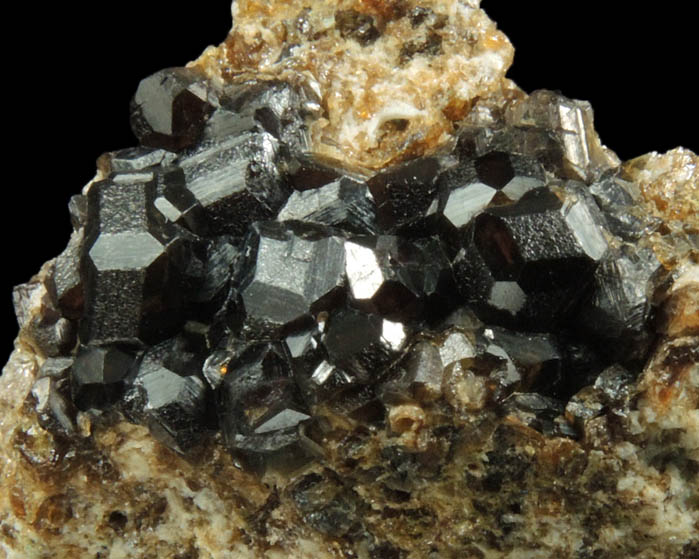 | Description: | Lustrous dark grossular garnet crystals on crystallized brown grossular matrix. The grossular garnet crystals are combination of dodecahedral-trapezohedral form. The largest grossular crystals are black, the small crystals are translucent yellow-brown. Collected ca. 1990 |