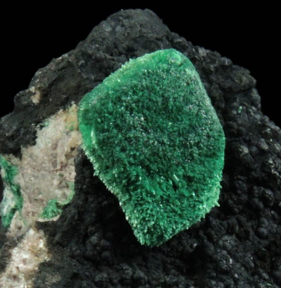| Description: | Velvety fibrous green malachite pseudomorph after a rhombic 9 mm azurite crystal on black oxide matrix. For more information about this occurrence see: Famous Mineral Localities - The New Cornelia Mine Ajo, Arizona in Mineralogical Record, v.14 #5. Originally acquired from the Neal A. Pfaff (1947–2013) on 12 August 1995 |