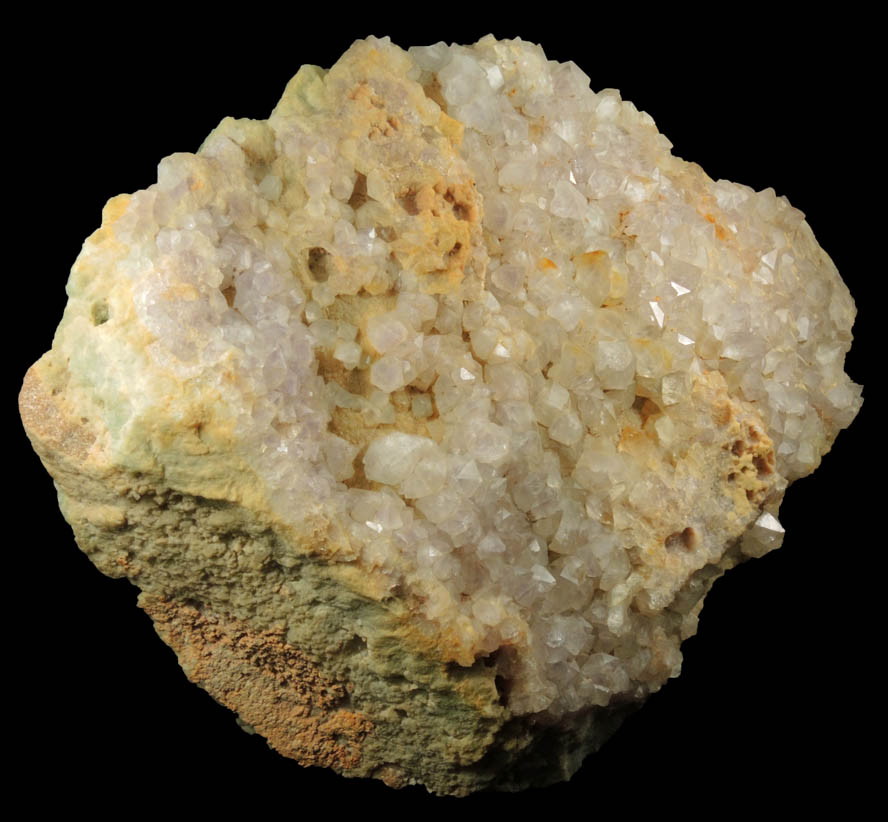 | Description: | Unusually large plate of pale-purple amethystine quartz crystals to 9 mm completely covering one face of a plate of translucent green fluorite. A few of the larger quartz crystals have medium-purple core zones, but most crystals are pale. Collected ca. 1975. This quartz outcrop was completely excavated by open pit mining ca. 1983. |