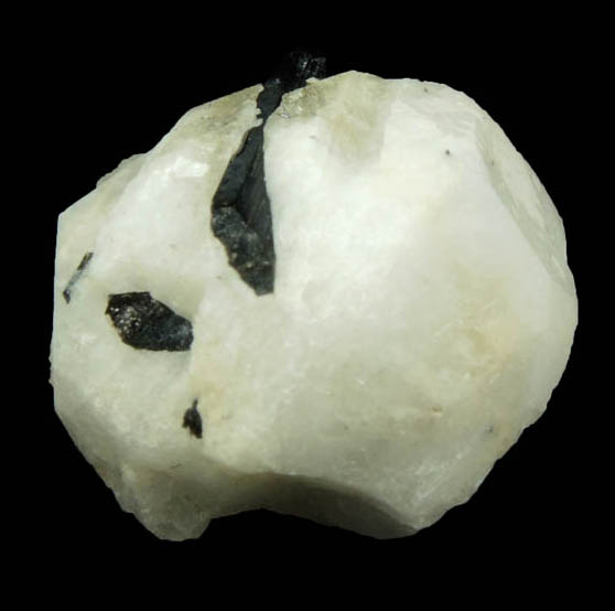 | Description: | Lustrous trapezohedral translucent white 20 mm analcime crystal with elongated black aegirine crystals to 15 mm embedded in the faces. Collected ca. 1985 |