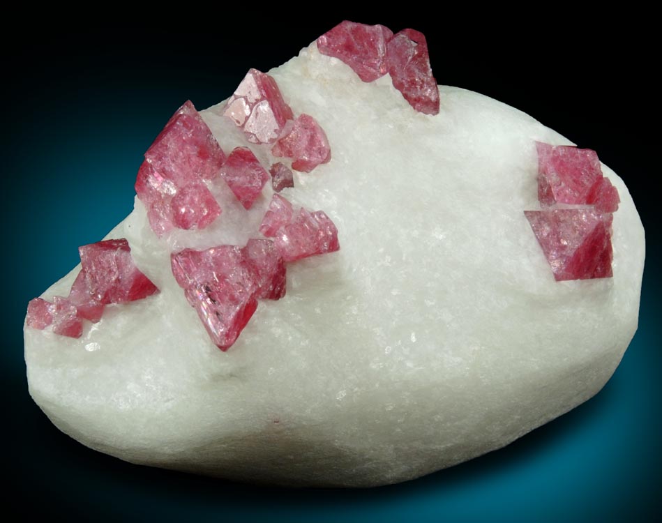 | Description: | Many lustrous translucent pink-red octahedral spinel crystals exposed on the surface of fine-grained white marble. One spinel crystal on the left-front are twinned on the octahedral {111} plane following the Spinel Law of isometric twinning. The spinel crystals fluoresce bright red under longwave UV illumination. This mine is now closed. |