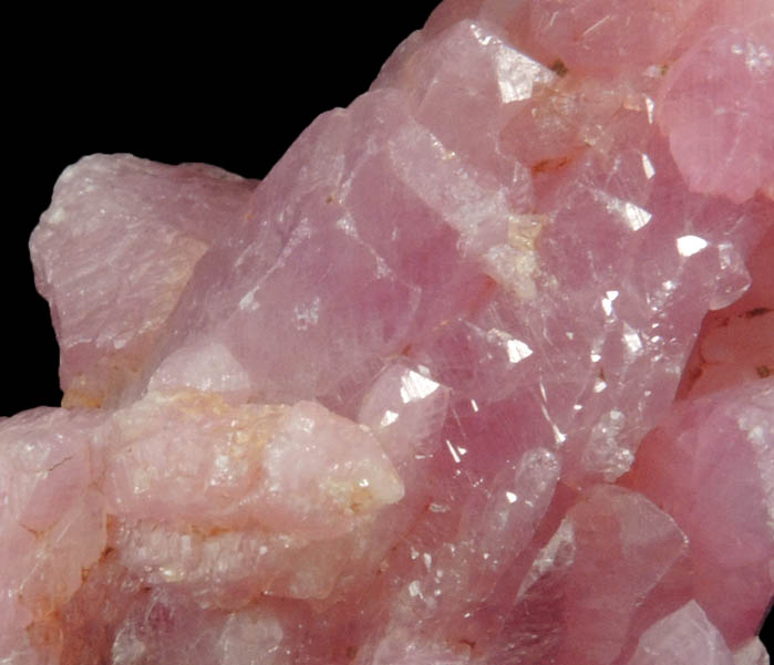 | Description: | Complex cluster of intersecting translucent pink sapphire crystals, the pink gem variety of the mineral species corundum, with striated crystal surfaces The sapphire crystals have slightly waxy luster on some faces, and brilliant luster in other areas. Fluoresces bright red under LW UV illumination. Weight: 28.0 grams. This mine is now closed |