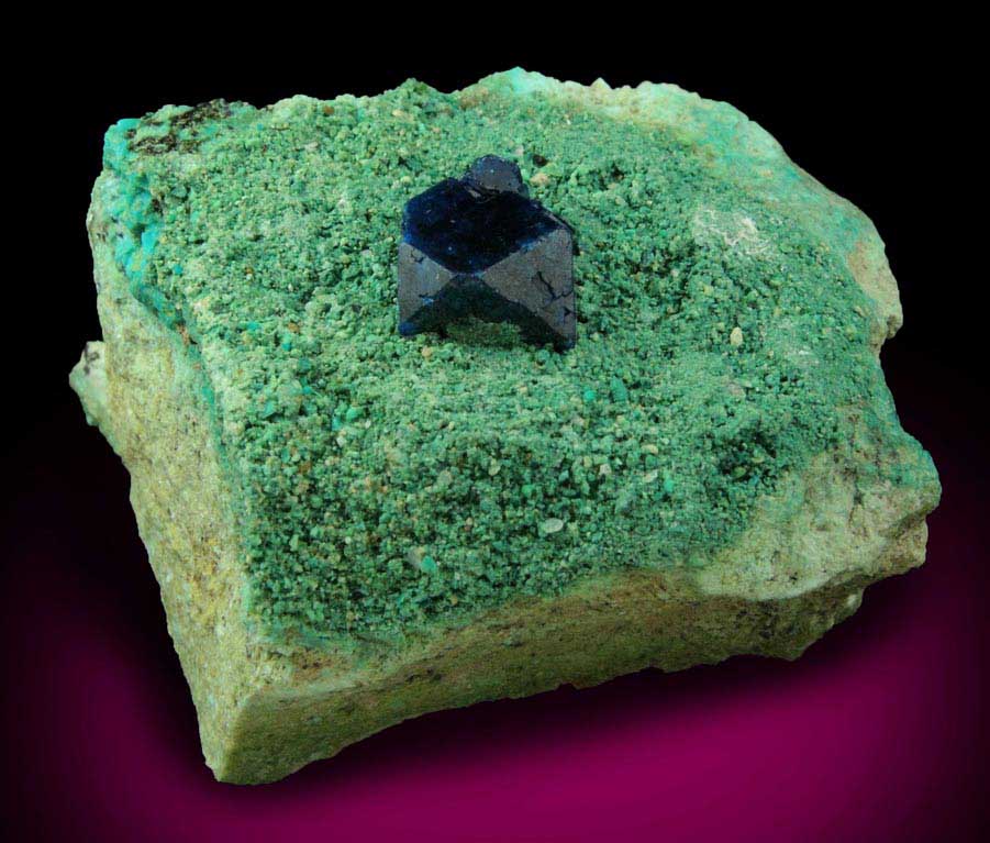 | Description: | Lustrous translucent dark-blue boleite crystals to 8 mm on matrix surrounded by grainy green paratacamite. The boleite crystals are cubic form, with {111} octahedral corner faces. The paratacamite occurred as loose grains that cemented to the matrix. These specimens are now recognized as fakes: the boleite crystals and surrounding paratacamite were glued onto matrix |
