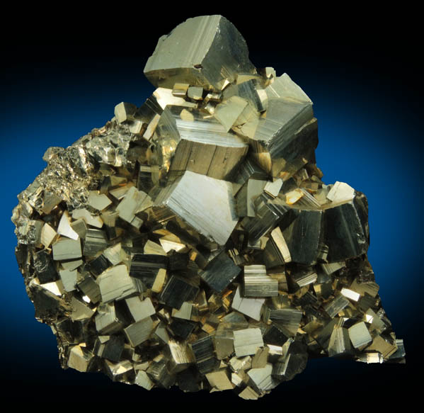 | Description: | Lustrous yellow-metallic pyrite crystals covering the front face of a crystallized mass of pyrite. The pyrite crystals are cubic form, with striated crystal faces. Originally acquired in 1995 from Porter Minerals (Golden, Colorado) |