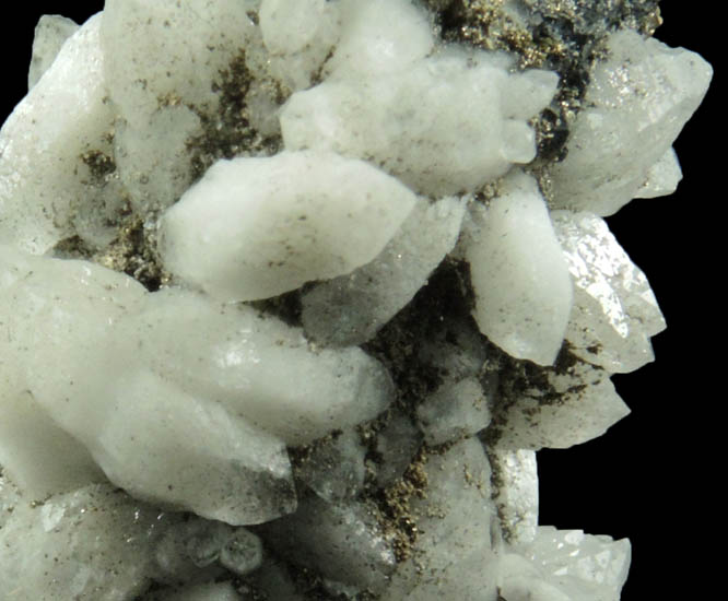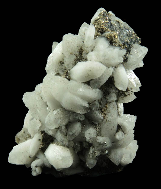 | Description: | Lustrous translucent white doubly terminated quartz crystals to 6 mm with translucent white rhombohedral calcite crystals to 3 mm and yellow-metallic pyrite microcrystals covering all surfaces front and rear od matrix. Collected ca. 1994 |