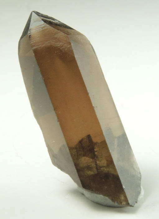 | Description: | Lustrous transparent smoky quartz crystal with no matrix on bottom. The smoky quartz has several extra crystal faces, uncommon in quartz, including second order pyramid {6061} and others that I have never seen before. Collected ca. 1993 |