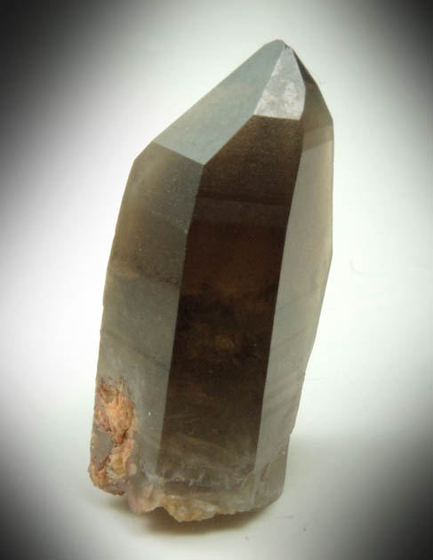 | Description: | Lustrous transparent smoky quartz crystal with remnants of tan microcline included in the base where it was attached. The smoky quartz upper third is a tapered shape because the sides are composed of second order pyramid {6061} faces. Collected ca. 1993 |