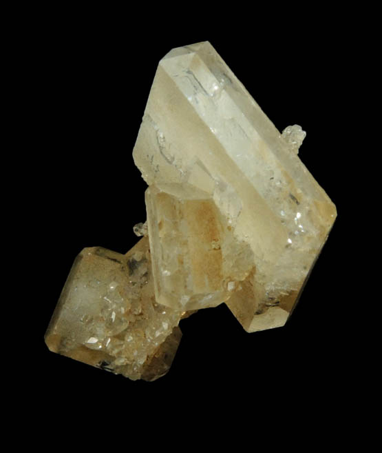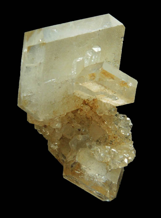 | Description: | Cluster of intersecting lustrous transparent pale-brown apophyllite crystals with no matrix. The apophyllite crystals are tabular (fattened) rectangular form with beveled {111} edge faces. Collected 23 November 1995. |