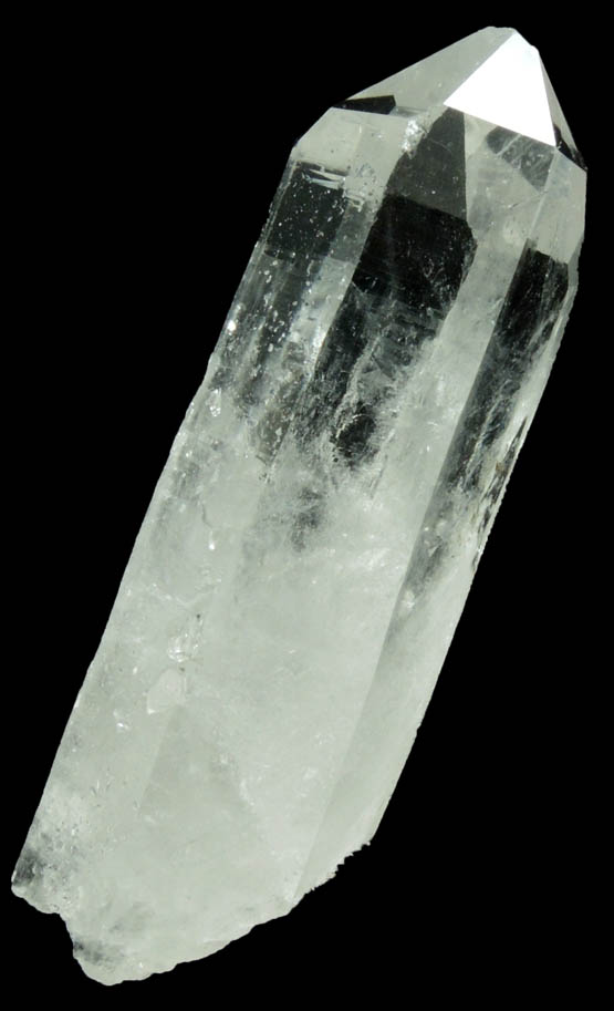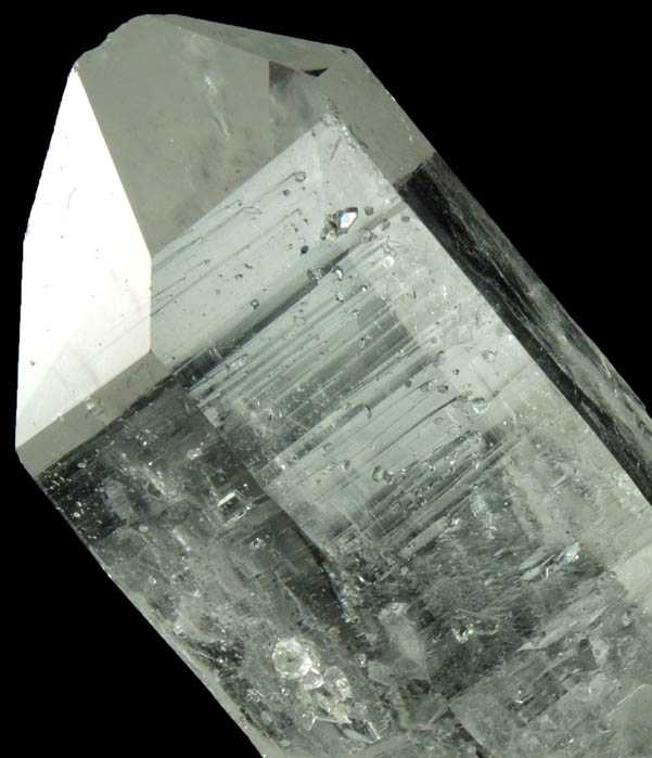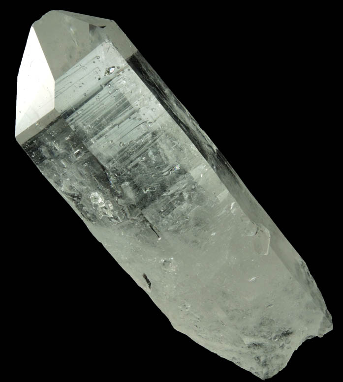 | Description: | Large lustrous transparent colorless quartz crystal with smaller sugar-like quartz crystals overgrown on two of the prism faces. The bottom third of the quartz crystal has wispy, cloud-like inclusions composed of microscopic fluid inclusions. |