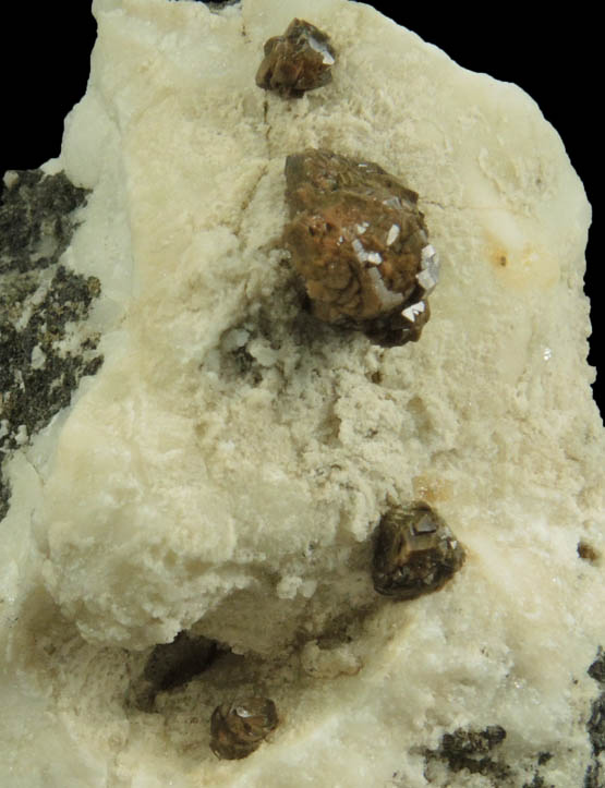 | Description: | Lustrous translucent brown heulandite crystals in several spherical aggregates to 6 mm on fine-grained colorless datolite on greenish basalt. Heulandite crystals was uncommon at Millington. Collected 22 October 1995. |