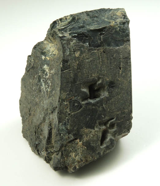 | Description: | Lustrous black jeffersonite partial crystal, the zinc- and manganese-rich variety of augite, with no matrix attached. The jeffersonite crystal has slightly waxy luster and several voids in the surfaces are lined with rounded crystal faces. Collected April 1993 |