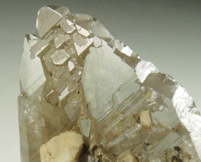 | Description: | Parallel interconnected lustrous transparent smoky quartz crystals with white feldspar included in some surfaces where the smoky quartz crystals were attached to the cavity wall. The smoky quartz crystals have a medium smoky color. Collected by G. Burke in August 1995 |