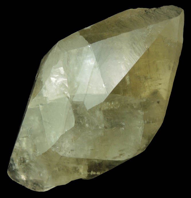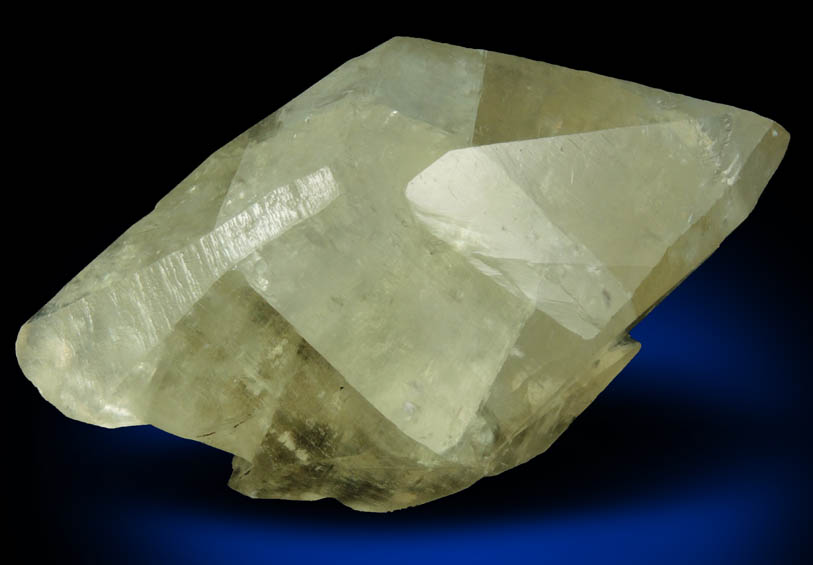 | Description: | Large lustrous pale yellow calcite crystal with remnants of gray matrix on the bottom. The calcite crystal is doubly-terminated, scalenohedral form with two smaller calcite crystals that are twinned to the main calcite crystal on the C-axis. Ex. Breck Kent collection |