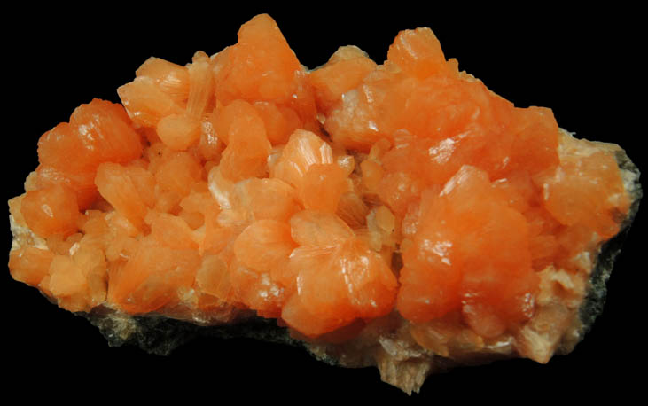 | Description: | Lustrous translucent vivid-orange bladed stilbite crystals to 8 mm in hemispherical aggregates to 12 mm diameter. This locality is in western New Jersey, not part of the Watchung Mountain trap rock quarrying district west of New York City. Collected ca. 1998 |