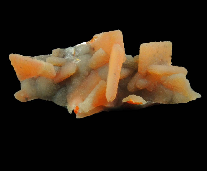 | Description: | Translucent orange bladed wulfenite crystals coated with translucent colorless hemimorphite microcrystals on gray matrix. The orange color of the wulfenite crystals is visible through the hemimorphite coating. Collected in 1997 |