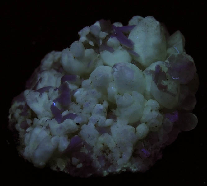 | Description: | Cluster of lustrous white transparent-to-translucent scalenohedral calcite crystals, plus minor prehnite and laumontite, with remnants of greenish basalt on the bottom. The calcite crystals fluoresce white under longwave and shortwave UV illumination. Collected 2 May 1993 |