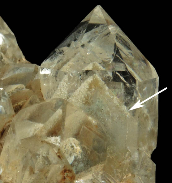 | Description: | Lustrous transparent colorless quartz crystals with internal phantom-growth zones where an earlier generation of quartz crystal was overgrown with white microcrystals of an unknown mineral, then was encapsulated with later quartz overgrowth. Collected by P. Young ca. 1962 |