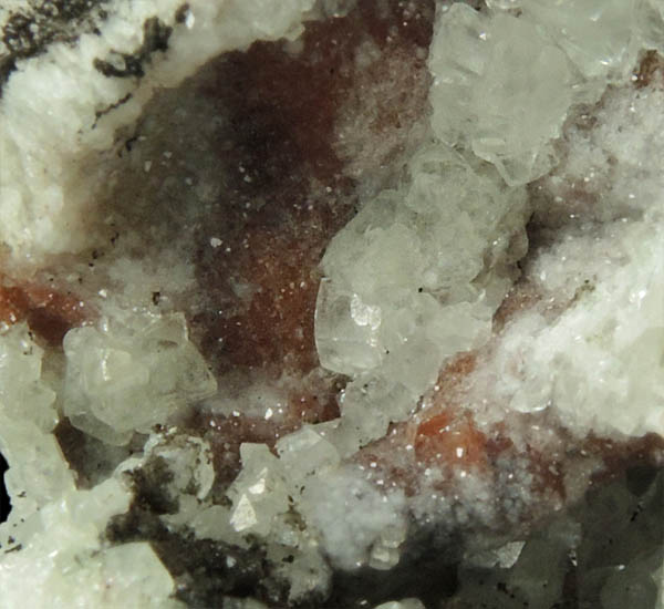 | Description: | Small cavity lined with lustrous transparent-to-translucent colorless rhombohedral calcite crystals to 2.5 mm over an earlier generation of smaller crystals (calcite? apophyllite? analcime?) with microscopic red hematite inclusions. Collected ca. 1995. |