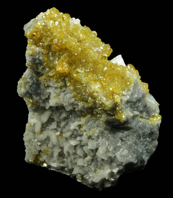 | Description: | Rich specimen of many lustrous transparent yellow sphalerite crystals to 1.5 mm on translucent white dolomite crystals to 3.5 mm covering three sides of gray limestone. Small metallic pyrite crystals to 0.1 mm are visible when viewed under magnification. Collected September 2007 |