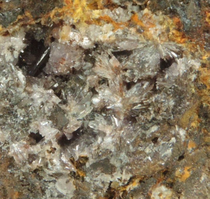 | Description: | Classic specimen with small cavities lined with lustrous transparent pale-pink bladed strengite crystals, earthy black goethite-hematite, acicular yellow cacoxenite crystals, and yellow-green hemispherical dufrenite-kidwellite crystals. Ex. Ted Morley collection; originally acquired ca. 1960 |
