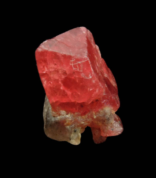 | Description: | Lustrous transparent-to-translucent red-pink spinel crystal with a small fragment of brown matrix attached. The spinel crystal is complex octahedral form with concave depressions where it was intergrown with marble that later dissolved away. The spinel crystal fluoresces red under LW UV |