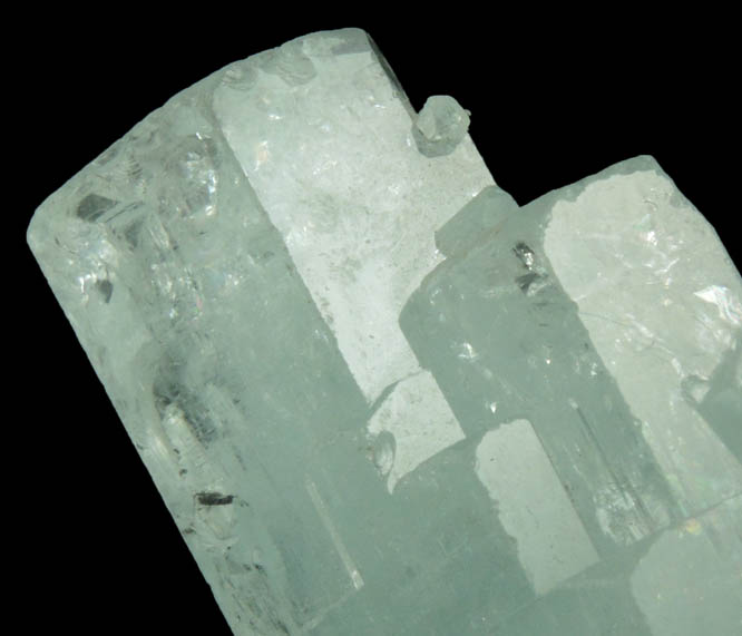 | Description: | Several interconnected lustrous transparent pale-blue aquamarine crystals, the blue gem variety of the mineral species beryl, in parallel orientation. The aquamarine crystals are hexagonal form with flat basal pinacoid terminations. Weight: 16.9 grams |
