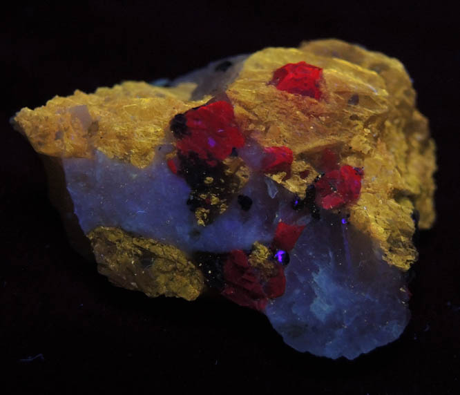 | Description: | Many lustrous transparent-to-translucent red spinel crystals in yellowish zircon (recognizable under SW UV) and gray marble with scattered yellow-metallic pyrite impurities. The spinel crystals are octahedral form with striated edges. The spinel fluoresces red under LW-SW UV; zircon fluoresces yellow under SW UV. |