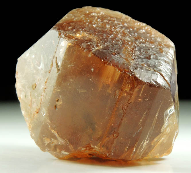 | Description: | Lustrous transparent brown gem-grade topaz crystal with flat termination composed of smaller parallel faces and glassy prism faces that make the internal clarity visible. The topaz has two flawless sections that could produce gemstones if faceted. Weight: 66.7 grams |