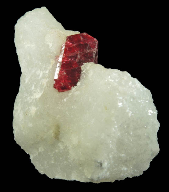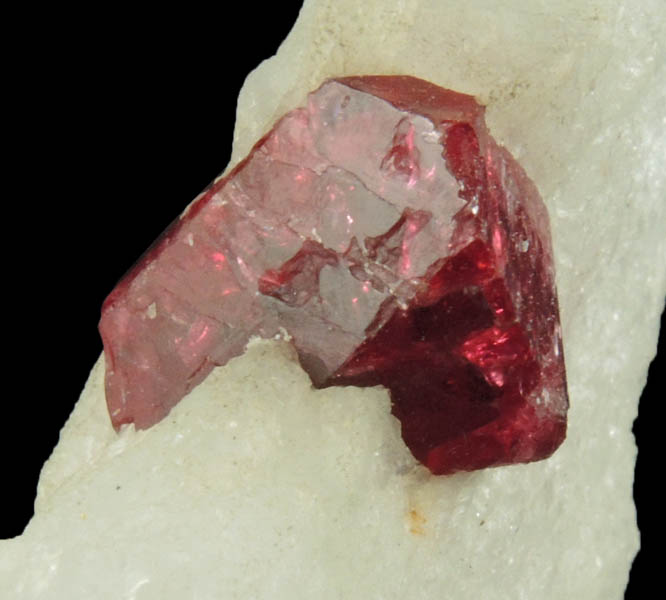 | Description: | Large lustrous translucent red spinel crystal in translucent white marble. The spinel crystal is octahedral form with mottled crystallization patterns on the faces. The spinel fluoresces red under LW-SW UV |