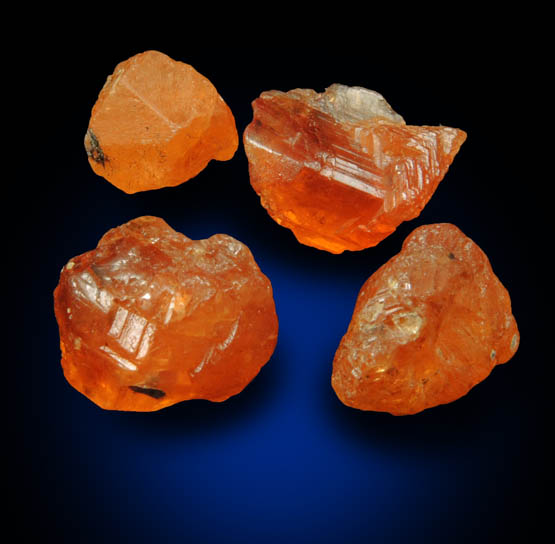 | Description: | Six crudely crystallized transparent orange spessartine garnet crystals with no matrix attached. These spessartine crystals are commonly used in jewelry or other decorative uses because of their bright orange color. Total Weight: 6.0 grams |