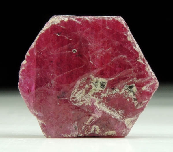 | Description: | Lustrous translucent pink ruby crystal, the pink gem variety of the mineral corundum, with no matrix. The ruby crystal is tabular hexagonal form, has deep pink color, with minor remnants of light-colored matrix on the edges and crevices on one face. Fluoresces red under LW UV illumination. Weight: 3.3 grams |