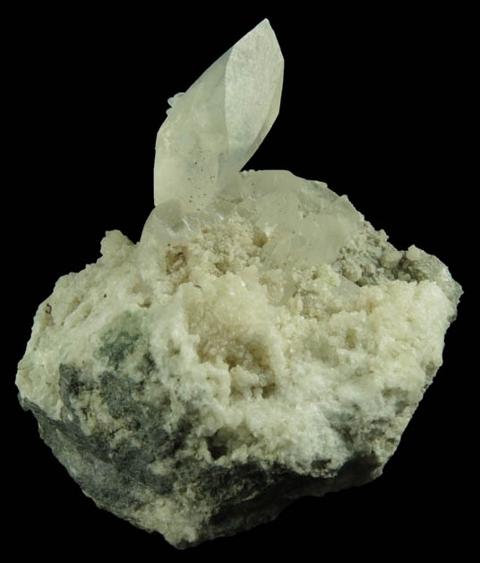 | Description: | Lustrous transparent colorless calcite crystals on pale yellow-green datolite. A 15 mm doubly terminated scalenohedral calcite crystal is perched on top of the other calcite crystals. The calcite fluoresces under LW and SW UV illumination. Collected in 1995. |