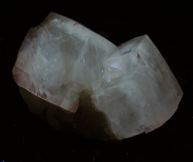 | Description: | Two intersecting lustrous transparent rhombohedral colorless calcite crystals to 14 mm over translucent green prehnite. The calcite crystals fluoresce under LW and SW UV illumination. Collected 29 January 1995. |