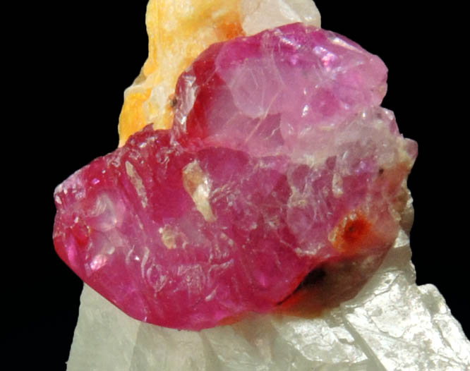 | Description: | Lustrous translucent pink ruby crystal, the pink gem variety of the mineral corundum, in light-colored marble. The ruby crystal has broad termination faces, with stepped crystallization patterns. Fluoresces red under SW-LW UV illumination. |