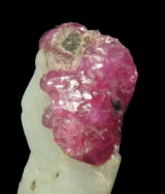 | Description: | Lustrous translucent red-pink ruby crystal, the pink gem variety of the mineral corundum, in light-colored marble. The ruby crystal is hexagonal form, with naturally crystallized mottled surfaces. Fluoresces red under LW UV illumination. Weight: 1.1 grams |