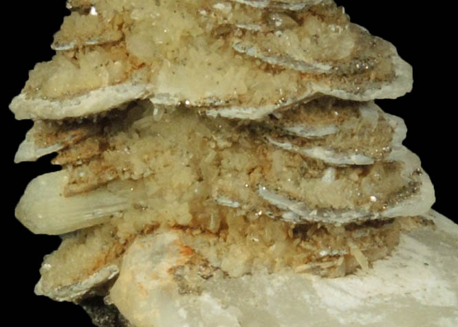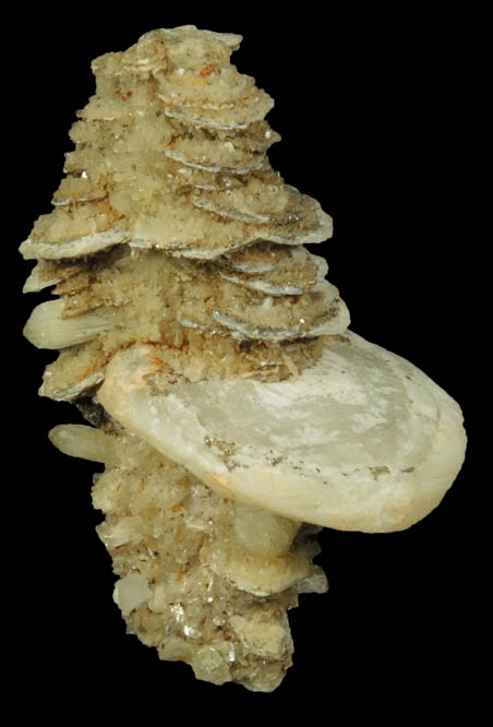 | Description: | Stalactitic formation of parallel translucent white calcite crystals to 23 mm with scattered overgrowth of yellow-metallic pyrite microcrystals. The calcite crystals are flattened, disc-like form and zoned from white rims to translucent cores. Collected by D. Swenson in April 2003 |