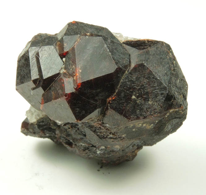 | Description: | Lustrous dark wine-red spessartine garnet crystals on a compact mass of spessartine garnet. The spessartine crystals are trapezohedral form, with satin-like surface luster caused by microscopic crystallization patterns on the surfaces. Collected by D. Swenson in June 2008 |