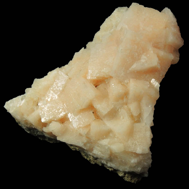 | Description: | Triangular plate of lustrous translucent pale pink-orange chabazite crystals to 14 mm. The surfaces of the chabazite crystals have microscopic dissolution etching typical of crystals that were intergrown with gmelinite, which later dissolved away. Collected in 1980s to 1990s by Prof. Martin Becker |