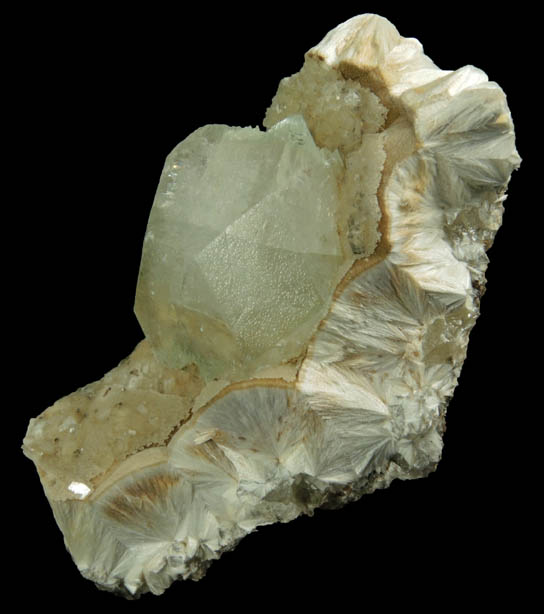 | Description: | Lustrous transparent pale-green doubly-terminated apophyllite crystals to 20 mm on fibrous white pectolite crystals to 8 mm in convex aggregates of radiating crystals. The apophyllite crystals are square prisms with pyramidal terminations. Collected in 1990s by Prof. Martin Becker, author of Recent Mineral Finds at the Millington Quarry in Rocks and Minerals v.73 #5 |