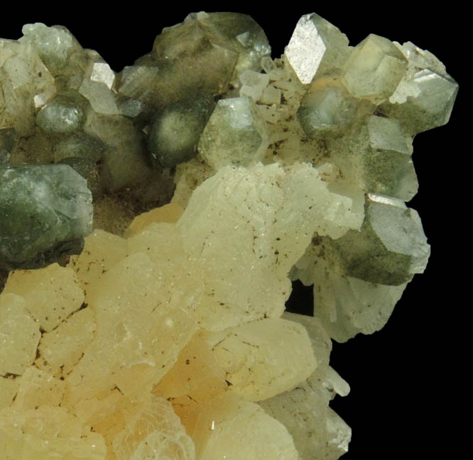 | Description: | Unusually large crystals to 10 mm(!) of translucent yellow-green prehnite in fan-shaped aggregates with lustrous transparent colorless apophyllite crystals to 8 mm colored green by chlorite inclusions over a 27 mm rhombic colorless calcite crystal. Collected in 1990s by Prof. Martin Becker, author of Recent Mineral Finds at the Millington Quarry in Rocks and Minerals v.73 #5 |