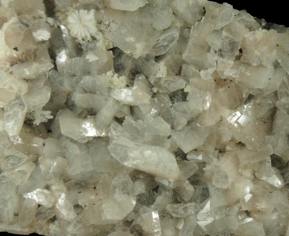 | Description: | Double-sided plate of lustrous transparent-to-translucent colorless heulandite crystals to 10 mm with stellate groups of prismatic white laumontite crystals to 4 mm. The rear of the plate is covered with small rhombohedral colorless calcite crystals. Collected in 1980s to 1990s by Prof. Martin Becker |
