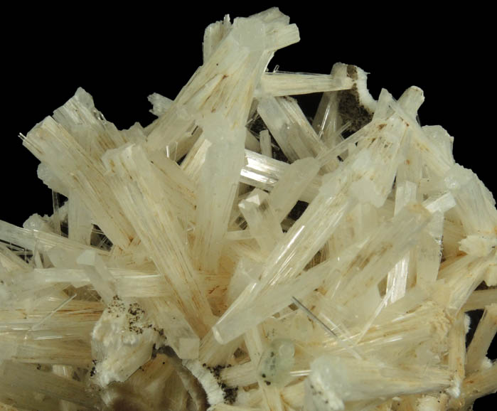 | Description: | Complex cluster of intersecting slender natrolite crystals to 30 mm long over concave formations if fibrous white pectolite. The natrolite crystals vary from translucent white to transparent colorless termination zones, and have pyramidal terminations. Collected in 1990s by Prof. Martin Becker, author of Recent Mineral Finds at the Millington Quarry in Rocks and Minerals v.73 #5 |