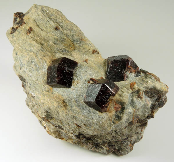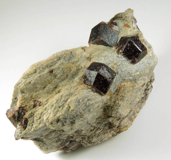 | Description: | Lustrous red-brown almandine garnet crystals in gray schist. The almandine garnet crystals are dodecahedral form with thin trapezohedral edge faces. Collected ca. 1992. This site is now a private home and closed forever to collecting |