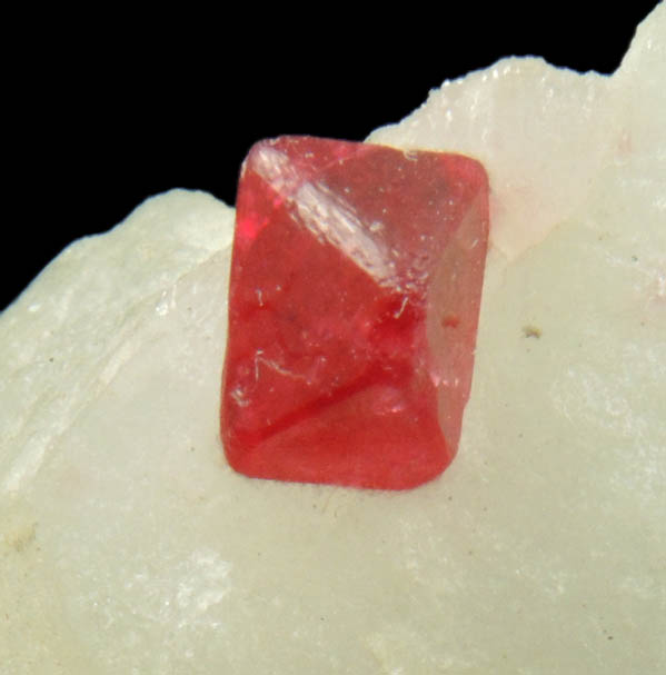| Description: | Lustrous transparent red spinel crystal partially exposed in contrasting white marble. The spinel crystal is octahedral form, with smooth crystals faces, and fluoresces vivid-red under longwave ultraviolet illumination. |