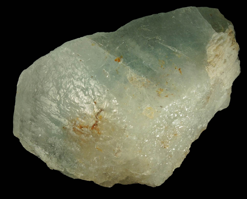 | Description: | Large crystal of transparent-to-translucent blue aquamarine, the blue gem variety of the mineral species beryl, with white albite inclusions on one end. The aquamarine is color zoned and has small parallel crystal faces on some surfaces. Collected ca. 1995 |