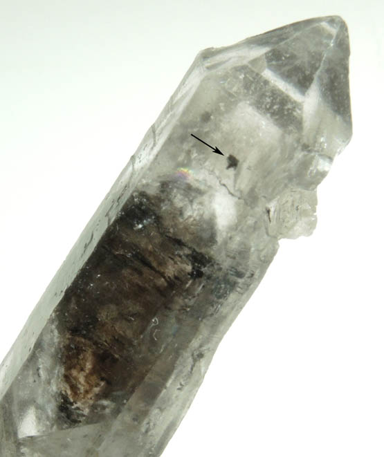 | Description: | Doubly terminated transparent colorless quartz crystal with a dark center section caused by foreign material in linear internal cavities. In the upper termination are three round black inclusions in fluid-filled cavities that easily move when rotated. Collected in 1995 |